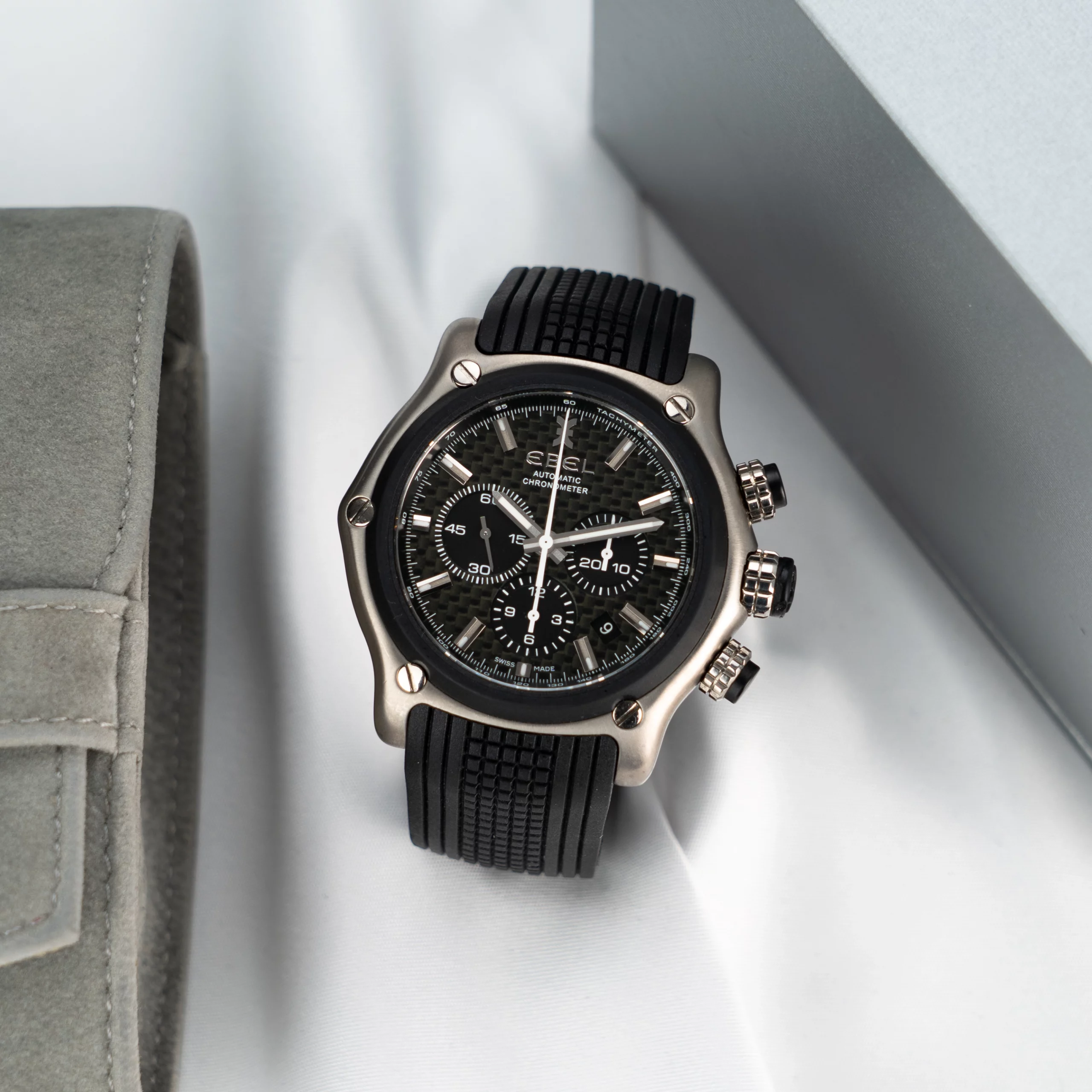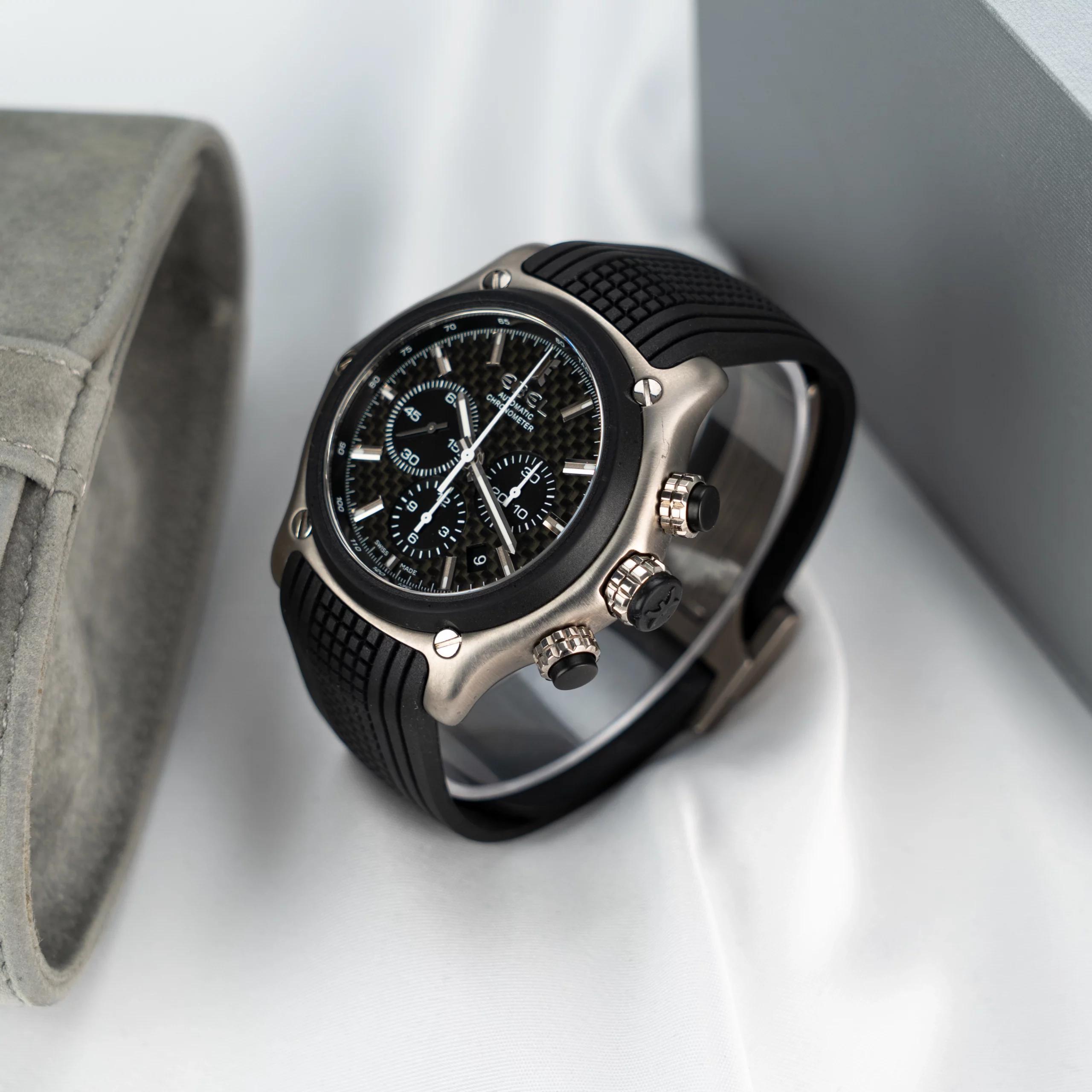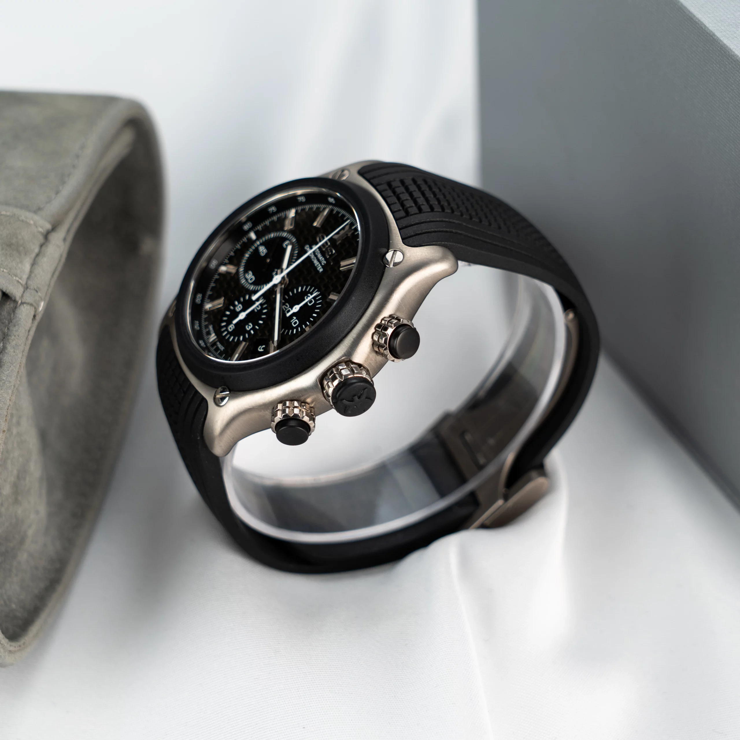 * Lieferumfang Travelpouch und Servicerechnung (Ersatz Armband + Tausch aller Dichtungen, Drücker und Glas)