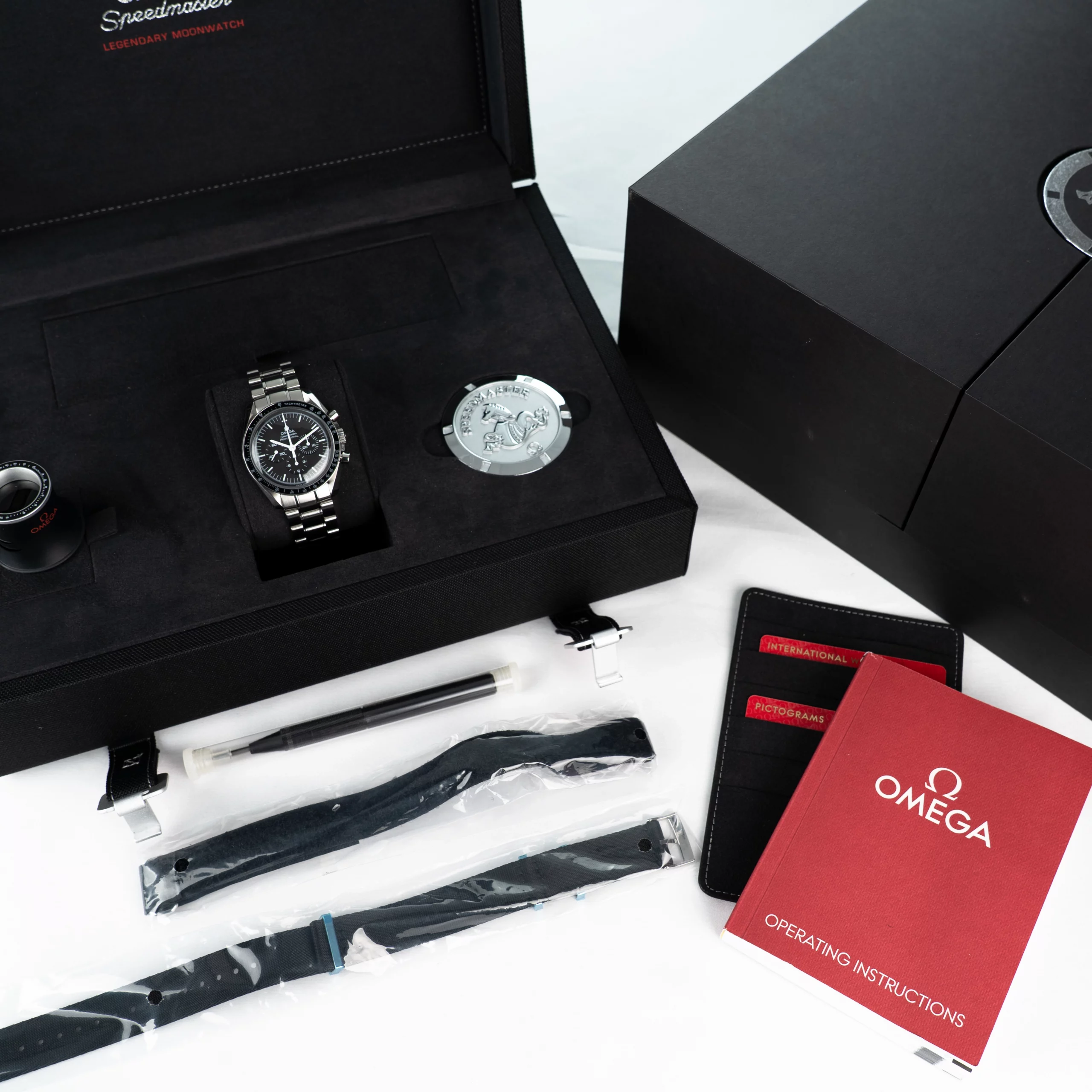 * Lieferumfang mit Box, Umkarton, Garantiekarten, Booklet, Lupe, Federstegwerkzeug, zwei weiteren Armbändern und Erstkaufrechnung